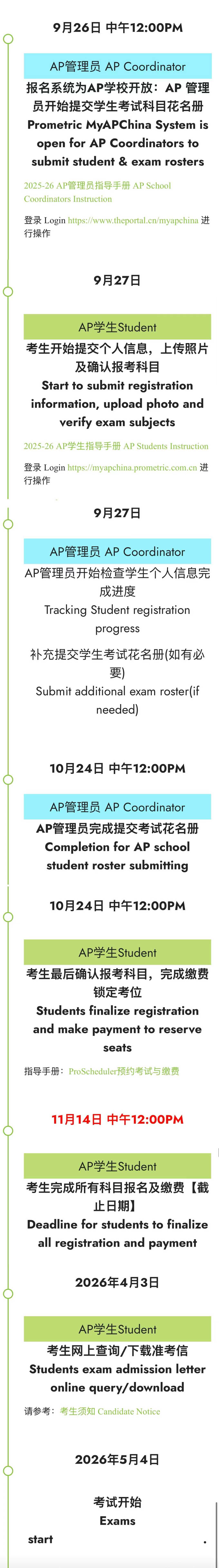 与此同时,在校考生的报名流程已同步启动,关键时间节点需把握:9 月 26 日起可向学校 AP 管理员登记报名,10 月 24 日前学校需完成考生花名册提交,11 月 14 日中午 12 点将关闭报名系统,考生需在此前完成所有科目确认及缴费,逾期将无法补报。2026 年 4 月考生可登录 MyAPChina 下载准考证并查询考点信息,考试将于 2026 年 5 月如期举行。