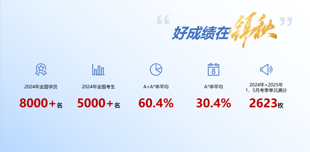 2024年度,全国学员8000+名,全国考生5000+名,A+A*率平均60.4%,A*率平均30.4%。