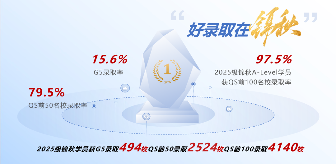 截至目前,2025级锦秋学员获G5录取494枚,QS前50录取2524枚,QS前100录取4140枚。
