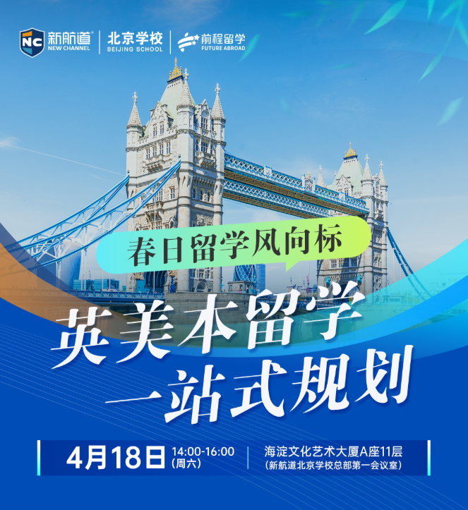 4约18日(本周六)下午14:00,新航道将举办【英国/美国留学规划会】