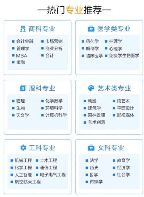 商科、工程、法律、教育、医学、人文社科、建筑、艺术、音乐等。