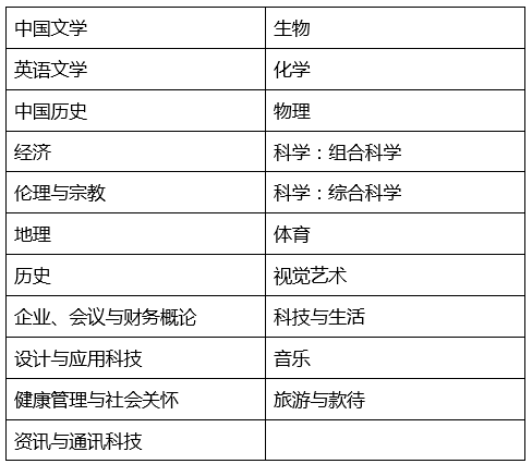 学生必须报考4个核心科目:中国语文、英国语文、数学及通识(公民与社会发展)及至少2个选修科目,加起来至少要考6科。选修科目是分别从DSE课程里“甲类高中科目”、“乙类应用学习科目”或“丙类其他语言科目”选取。