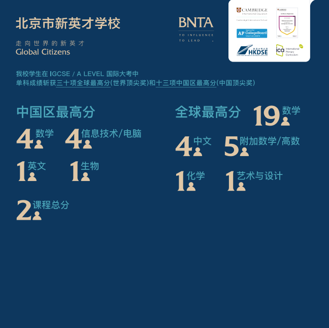 在历次国际大考中,新英才共计43人次拿到单科成绩分,共计30人次获得“全球奖”,13人次获得“中国考区奖”,覆盖学科包括:数学、附加数学、高等数学、英文、中文、化学、生物、信息技术、电脑、艺术与设计等。