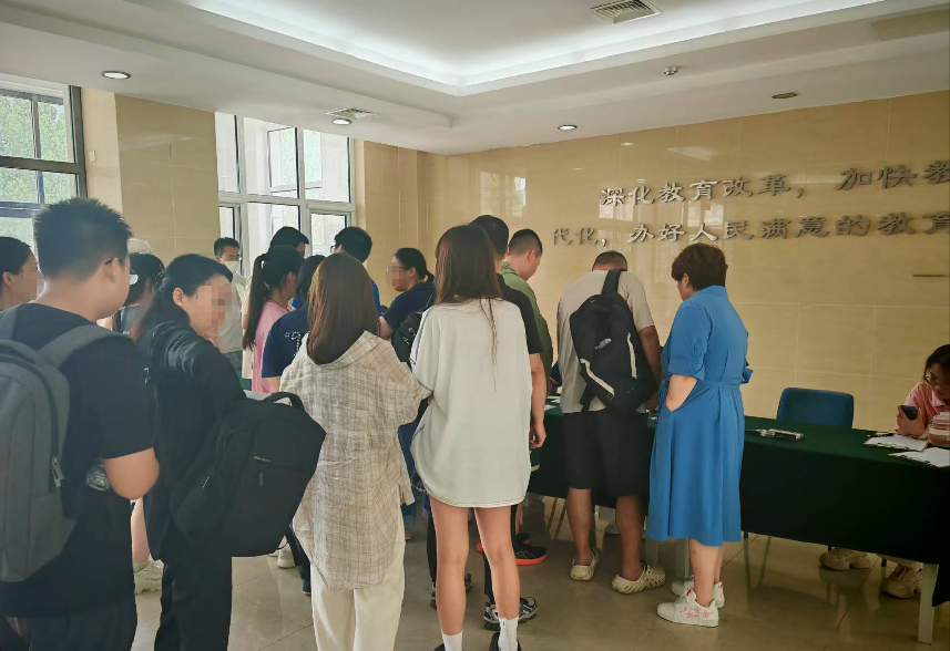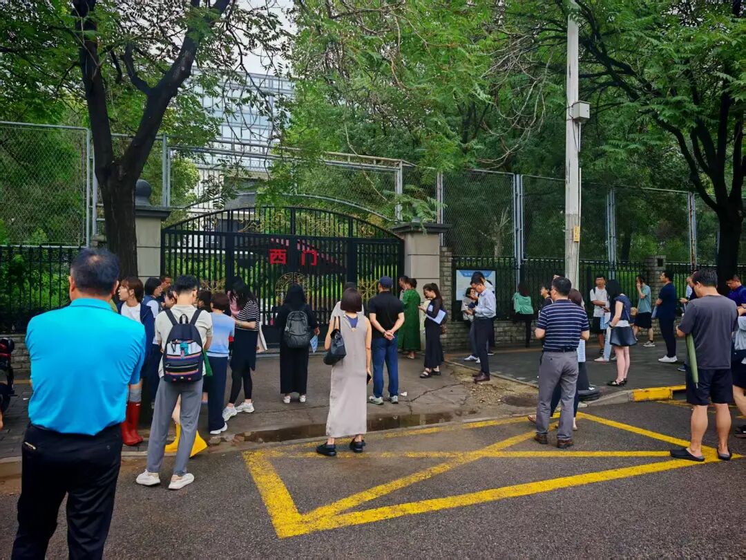 加试在西门,家长需要先在公众号扫码登记信息,等待学校通知进校加试。现场情况: