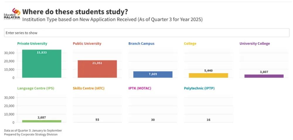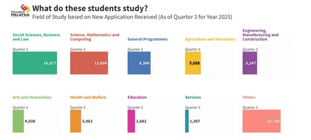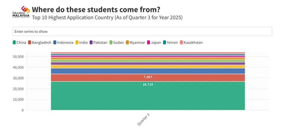 在这股马来西亚留学浪潮中,中国学生的表现最突出。根据2025年前三季度的留学生数据显示,中国学生申请量以26,725份强势登顶,数量几乎是第二名孟加拉国的四倍。