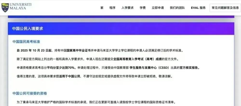 高考生赛道中,马来亚大学也更新了要求,中国高考生的录取门槛明确为高考总分的70%。如果高考总分750分要达到525分以上,总分600分需达到420分以上。
