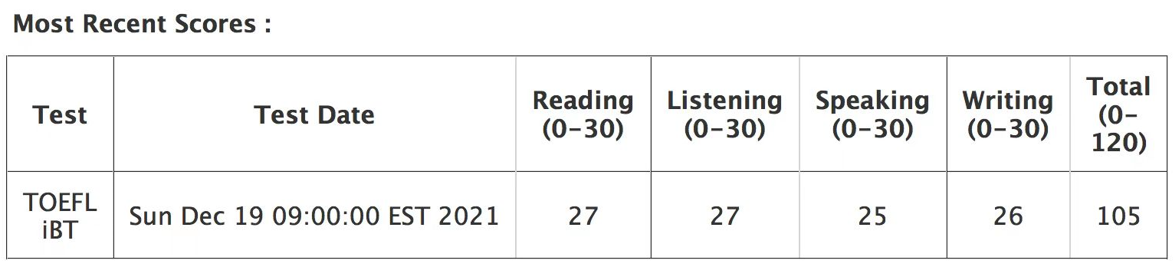 实考成绩: 托福 105 中考 648
