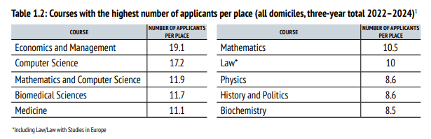 如图所示,经济与管理专业,每个offer的竞争人数达到19.1,成为牛津大学竞争最激烈的专业。竞争激烈程度仅次于它的是计算机科学,17.2个人竞争一个offer。数学与计算机科学专业夺得第三名。