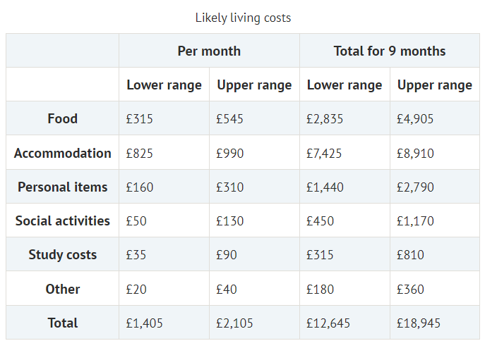 住宿和生活费用介于£1405-£2105/月。