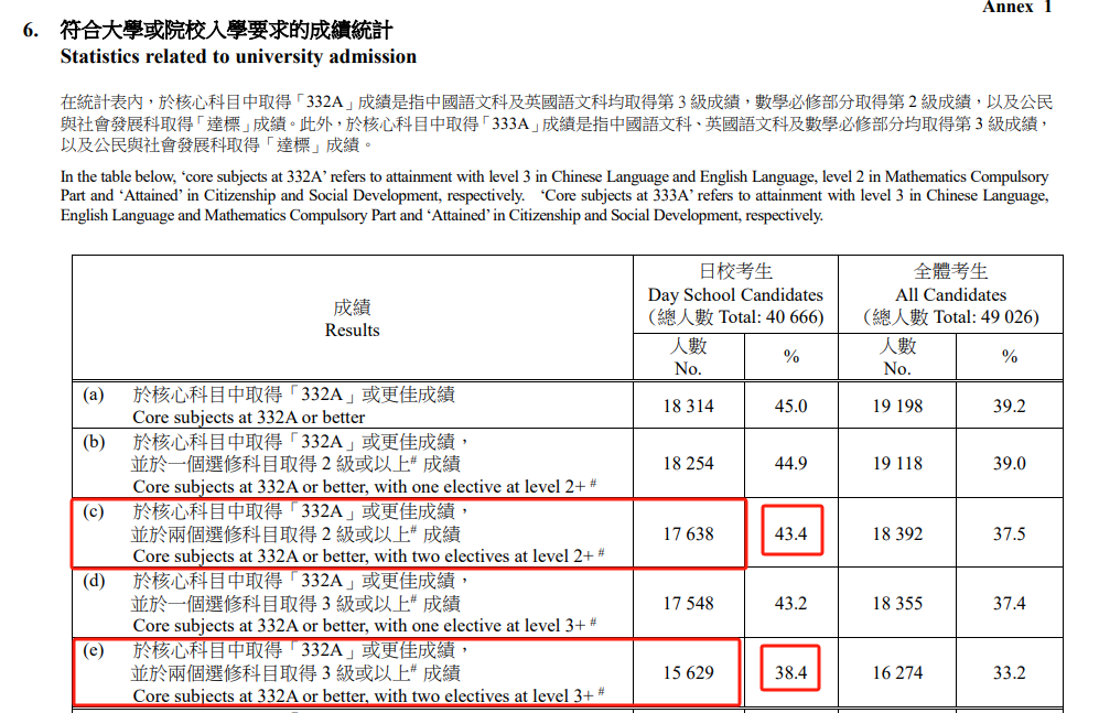 其中,达到香港前六院校,即香港大学、香港中文大学、香港科技大学、香港理工大学、香港城市大学和香港浸会大学收生要求332A+33的考生人数有15,629人,占比38.4%。