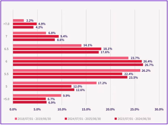 *图表:雅思学术类成绩各分数梯队分布(数据来源:英国文化教育协会中国大陆地区学术类雅思考生成绩大数据,统计周期:2024年7月1日至2025年6月30日,2023年7月1日至2024年6月30日,2018年7月1日至2019年6月30日)