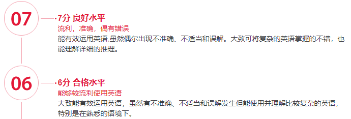 雅思要求:共8个等级分为A-H,等级为A级,要求总分7.5分,单项成绩不低于7.0分。等级为H级,要求总分6.5分,单项成绩不低于6.0分。