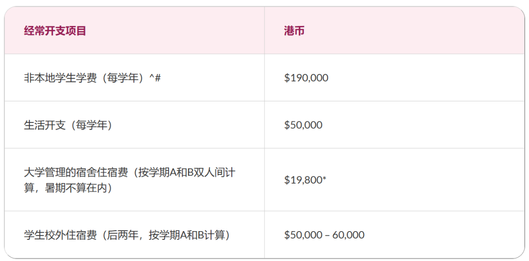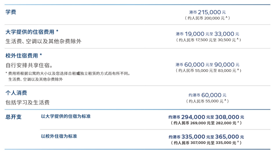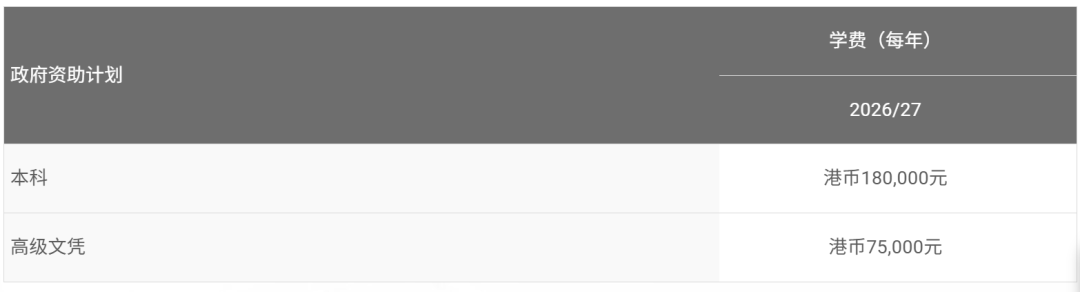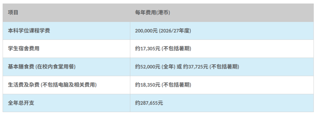 2026/27学年全年学费为港币190,000元,分上、下学期缴交。该费用日后或会调整,大学将另行通告。