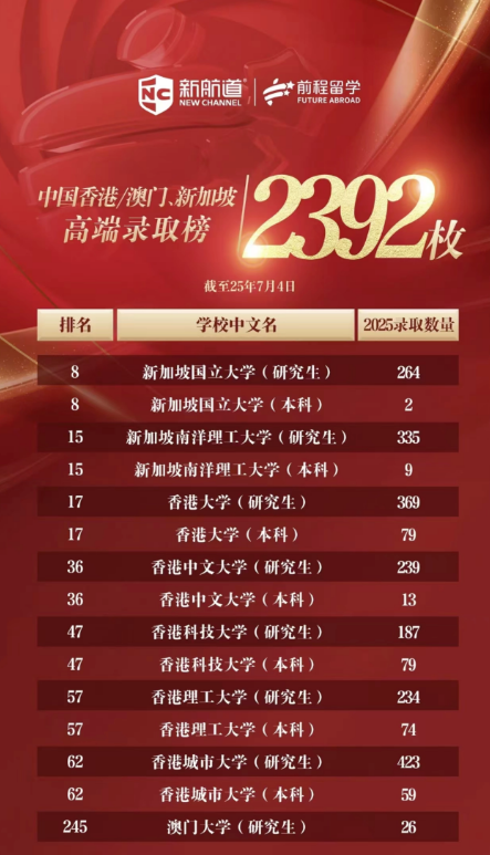 同时,随着香港城市大学明确退出高考统招通道,目前“港八大”院校中,仅剩香港中文大学保留高考统招。其余港校全部采用独立申请制,不占用高考志愿名额,更灵活,也更适合提前规划升学路线的学生家庭。