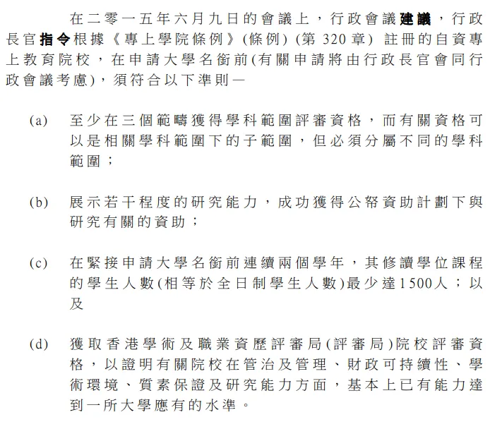 对于想要升格为私立大学的自资院校,中国香港政府有着明确的要求,具体如下: