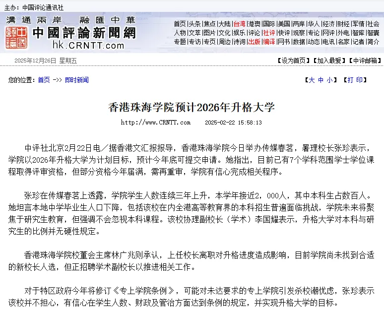 香港珠海学院署理校长张珍表示,学院以2026年升格大学为计划目标。