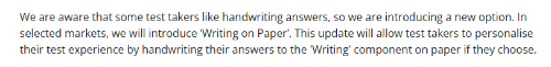 这一更新将允许考生在考试中选择将写作部分的答案手写在纸上完成,从而为考生提供更加个性化的考试体验。