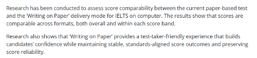 公告指出,官方已经开展研究,对当前纸笔考试与机考中 “Writing on Paper” 这一形式之间的成绩可比性进行了评估。
