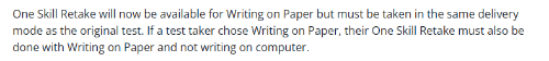 公告还说明,One Skill Retake(单科重考) 在 “Writing on Paper” 模式下同样适用。
