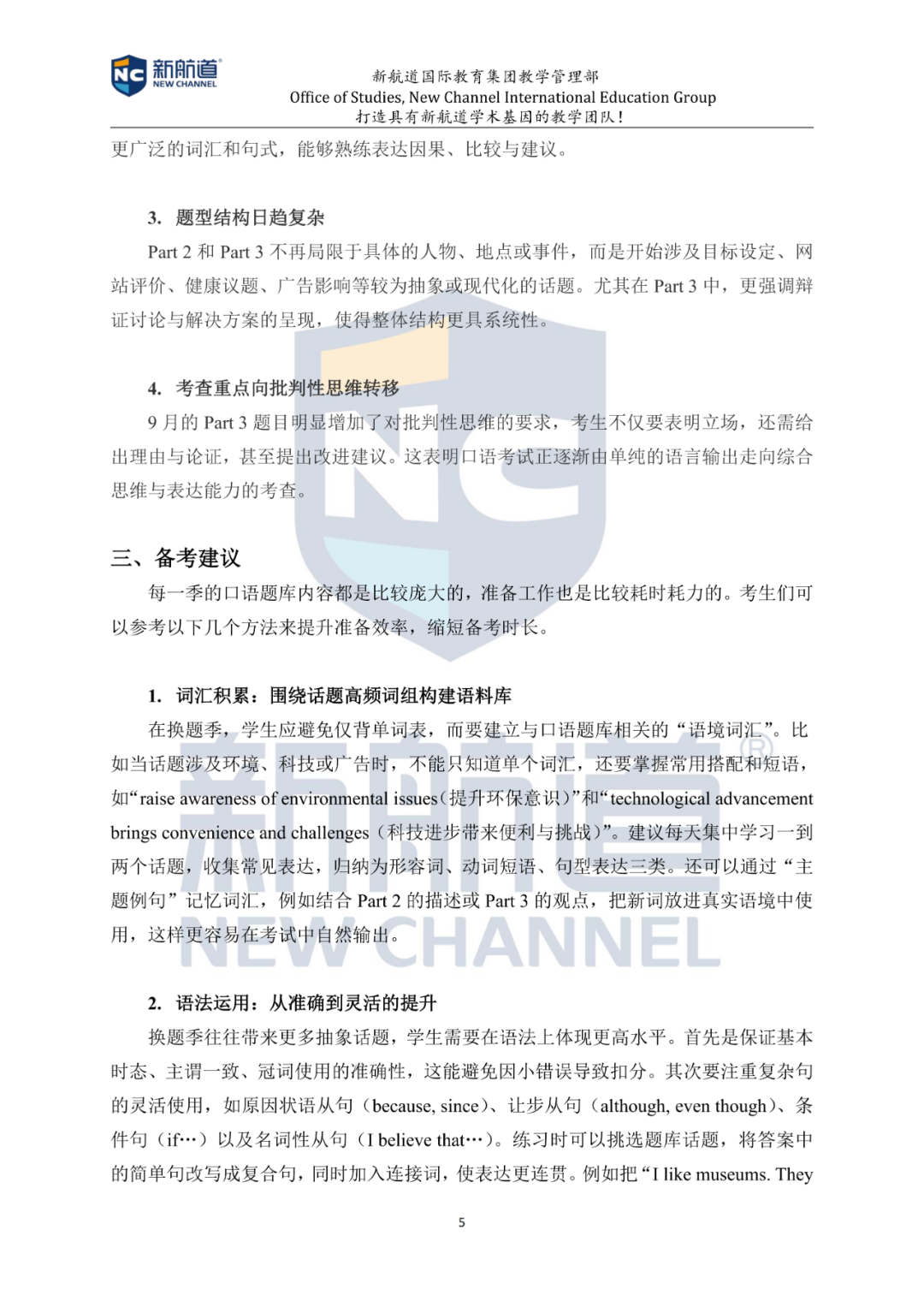 口语题库依旧按照1月、5月、9月更新。整体来看,Part 1 从生活话题延伸到数字生活、环保、广告、科技等社会议题,Part 2/3 题目则更注重考生的思辨与表达逻辑。