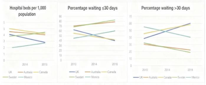 The line graphs compare the UK, Australia, Canada, Sweden and Mexico across two aspects (the number of hospital beds per 1,000 people and the proportion of people waiting for less than or more than one month for elective surgery) in 2010, 2014 and 2018.
