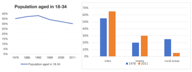 The line graph illustrates the proportion of the population aged 18 to 34 in a certain country from 1978 to 2011, and the bar chart compares the geographical distribution of this age group across urban, town, and rural areas in 1978 and 2011.