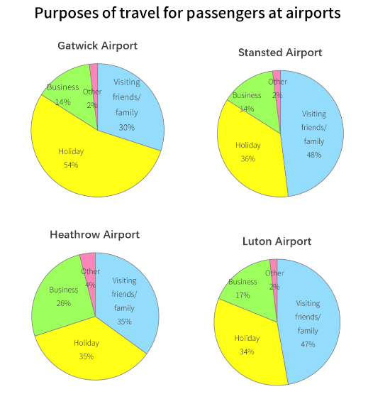 - Heathrow Airport:黄色(holiday)、蓝色(visiting families and friends)占比相同(35%);绿色(business)占比26%,大约是红色(other)的4倍