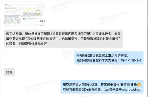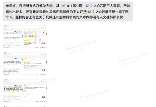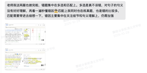 方法的转变伴随着阵痛。在最初的几次练习中,她的正确率甚至有所下滑,不安全感再次袭来。这时,我刻意淡化了对错结果,转而强化她的每一个微小进步。“看,你这道题定位非常!”“这次你只用35分钟就完成了前两篇,速度上来了!”
