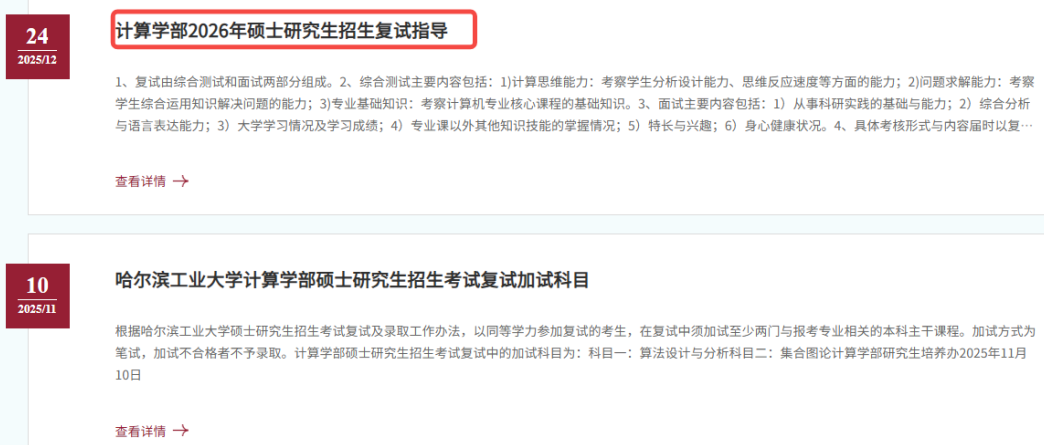 哈尔滨工业大学计算学部发布了2026年硕士研究生招生复试指导,此前还公布了复试加试科目,有报考该专业的同学一定要重点关注。