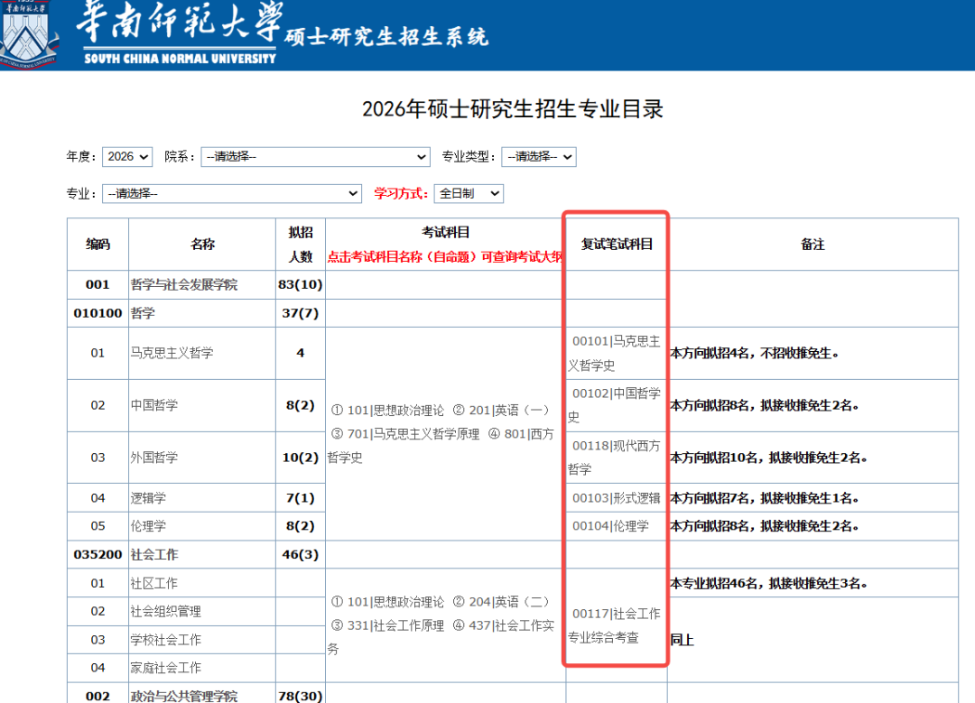 在华南师范大学2026年硕士研究生招生专业目录的复试笔试科目一栏,即可查询复试专业课的考试内容与要求。