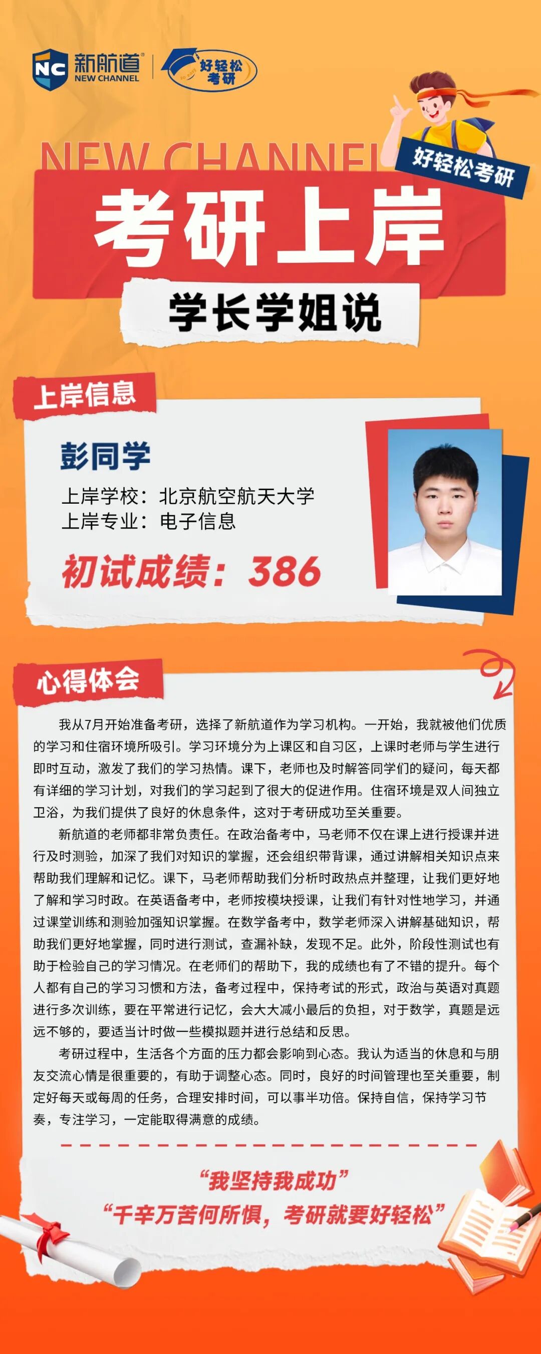 考研高分学员经验分享系列特辑,今天带大家解锁彭同学的「稳赢上岸密码」!凭借 386 分的扎实成绩,他成功斩获北京航空航天大学电子信息专业录取名额~