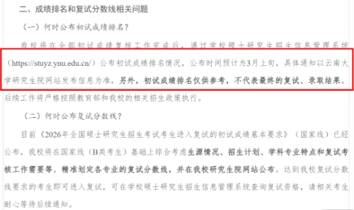 云南大学针对考生热点问题作出解答,明确3月上旬将公布初试成绩排名,研究生入学后将与导师进行双向选择。