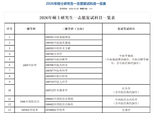 河北中医药大学发布一志愿复试科目一览表,中医学、中西医结合、护理、中药学等专业均明确了对应的复试笔试科目,部分科目包含中医经典相关考查内容。
