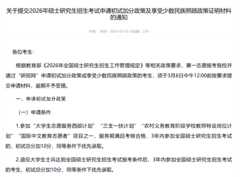 北方民族大学则对初试加分政策及少数民族照顾政策的申请条件、材料清单作出详细规定,所有申请材料需在3月6日中午12:00前完成线上提交与纸质版邮寄,同时明确报考专项计划的考生,不再享受初试加分和少数民族照顾政策。