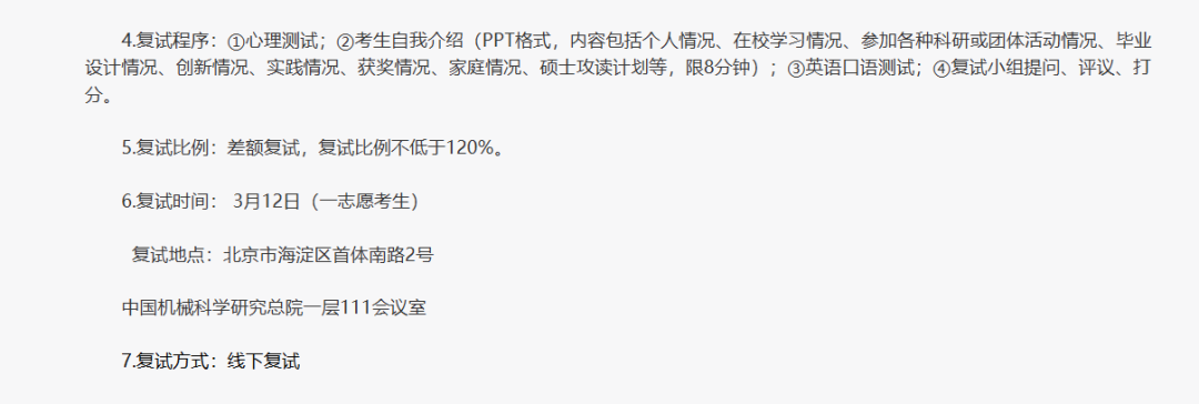 机械科学研究总院复试方式采用现场复试,一志愿考生复试时间为3月12日。