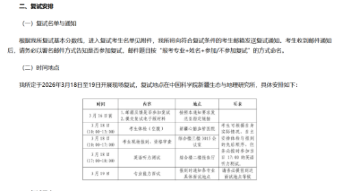 中国科学院新疆生态与地理研究所复试时间为:3月18日至19日,复试方式为:线下现场复试。