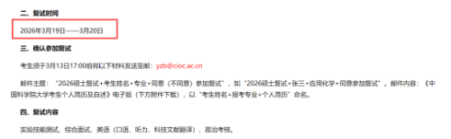 中国科学院成都有机化学研究所复试时间为:3月19日——3月20日,确认参加复试的考生须于3月13日17:00前将以下材料发送至邮箱。