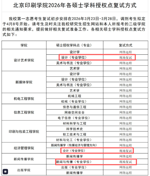 北京印刷学院研究生院官网发布通知,设计(专业学位)、会计(专业学位)、新闻与传播(专业学位)这三个专业需现场复试,其他专业均采用网络远程的复试形式。