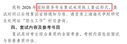 上海海关学院在2026年各学科专业硕士研究生招生复试工作实施细则中,明确“国际商务硕士,税务硕士,数字经济硕士”这三个专业采取网络远程复试。