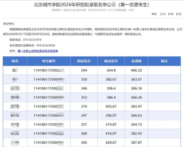 3月16日,北京城市学院发布2026年研招拟录取名单公示,公示期为3月17日-3月26日。