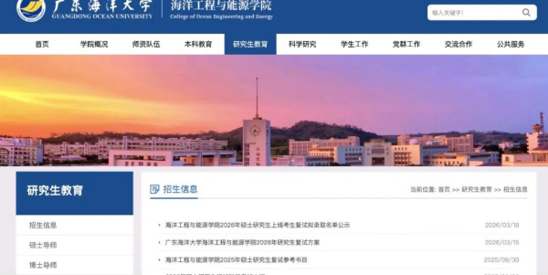 3月18日,广东海洋大学海洋工程与能源学院,发布了2026年硕士研究生上线考生复试拟录取名单公示。