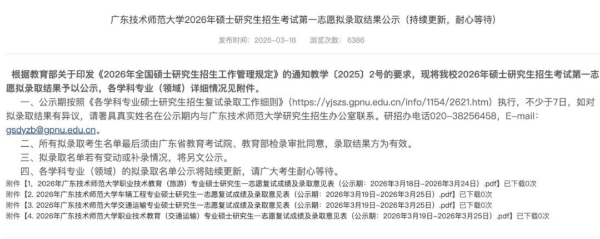 3月18日,广东技术师范大学发布2026年硕士研究生招生考试志愿拟录取结果公示。