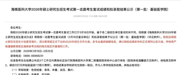 3月19日,海南医科大学发布2026年硕士研究生招生考试志愿考生复试成绩和拟录取结果公示。