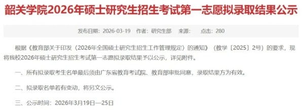 3月19日,韶关学院发布2026年硕士研究生招生考试志愿拟录取结果公示。
