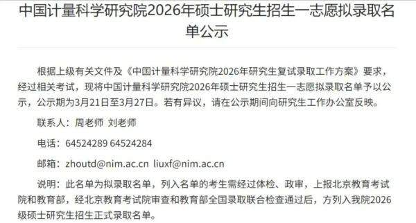 中国计量科学研究院发布2026年硕士研究生招生考试志愿拟录取结果公示。