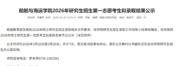 3月20日,广东海洋大学船舶与海运学院,发布了2026年硕士研究生上线考生复试拟录取名单公示。