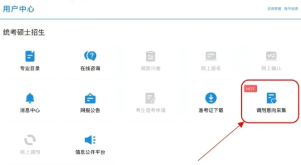 打开研招网,登录个人考研账号,找到「调剂意向采集」板块进入。