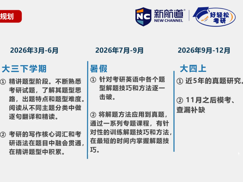 2027考研命题“去套路化”趋势已明确,选拔逻辑从“机械记忆”全面转向“知识运用与创新能力”考查,直接影响备考方向。很多大二、大三的同学不知道什么时候该干什么。参考新东方学管师的规划逻辑,新航道建议你按以下节奏来(现在开始刚刚好!):
