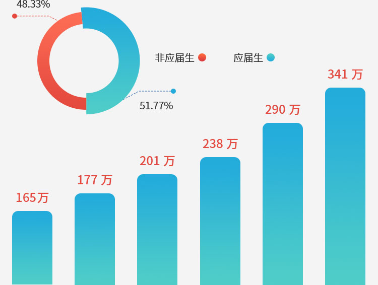 官方统计数据显示近五年报名人数趋势,其中往届生占比48.23%。2021年报名人数377万,2022预计465万,二战三战考生,同等学力考生,在职考研等群体加入,让考研变的更加优胜劣汰,全年长线备战必不可少。