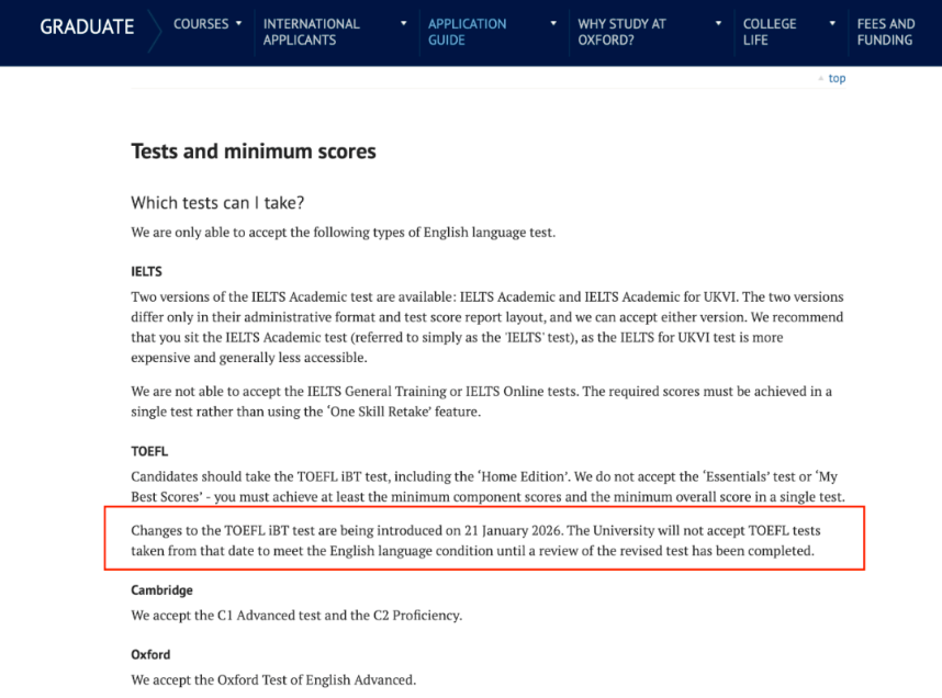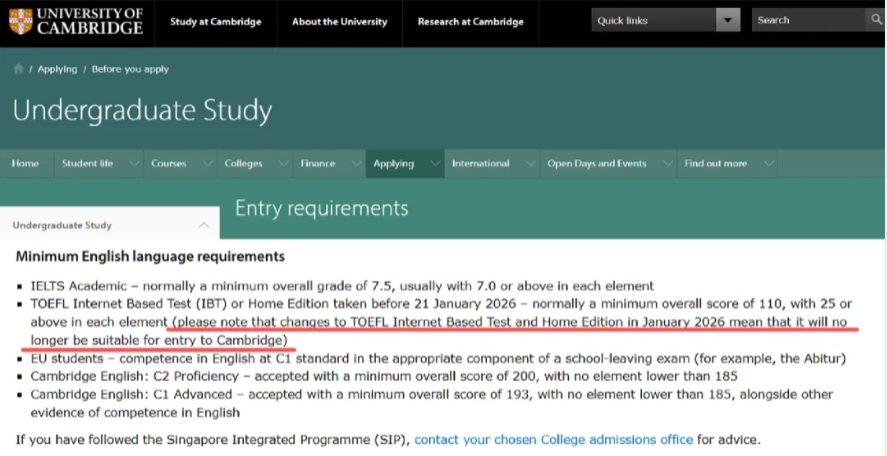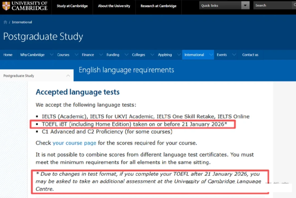 剑桥大学此前宣布:由于2026年1月托福考试的变动,其网考与家庭版成绩将不再满足入学要求。